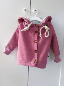 Die Jacke habe ich in Größe 86/92 genäht. Außen rosa-melierter Softshell und die Kapuze ist mit dem Bio-Jersey „Garden Bears“ von Staghorn gefüttert. Den Schnitt ist eine Mini-Naveen von Sara&Julez.